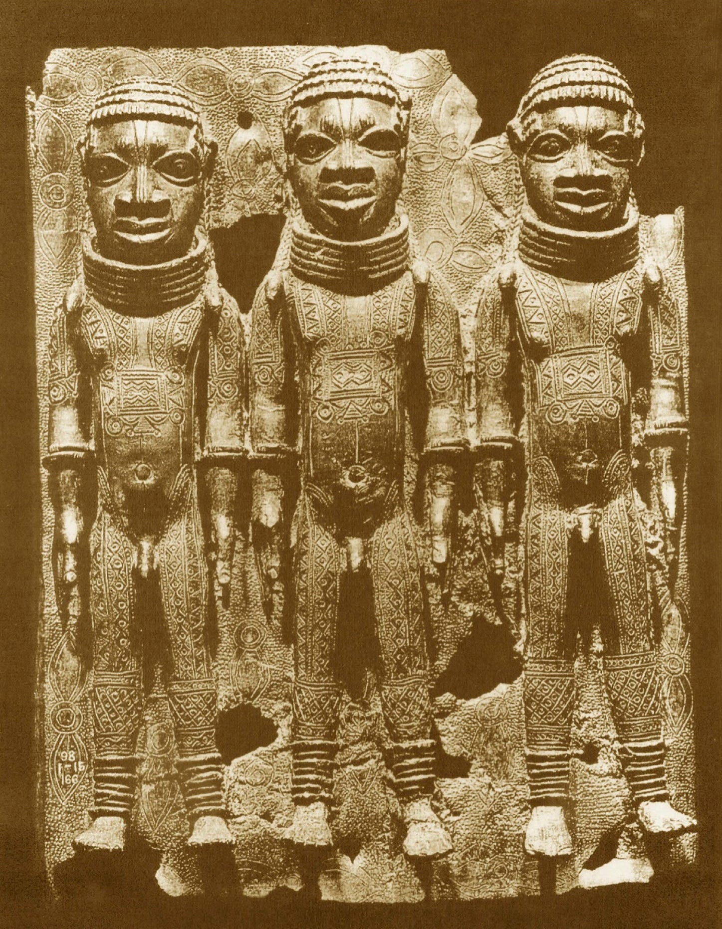In 1668, a Dutch traveler became the first and only outsider to view the plaques in place. By the time the next Dutchman arrived, they had been taken down, crated into large wooden trunks, and hauled farther inland for safety. For the next two hundred years, they served as a bulky card file on court etiquette to be consulted whenever a question came up concerning the proper dress or undress of a certain-rank official for a certain occasion. Centuries passed. Portuguese traders had come and gone; Dutch traders had come and gone. But when an English trade delegation died in an ambush in 1897, the British invaded the country, took over the government, discovered the trunks filled with artworks, and sent most of them off to museums around the world. (Notice they did not send the "indecent" one seen here.)
