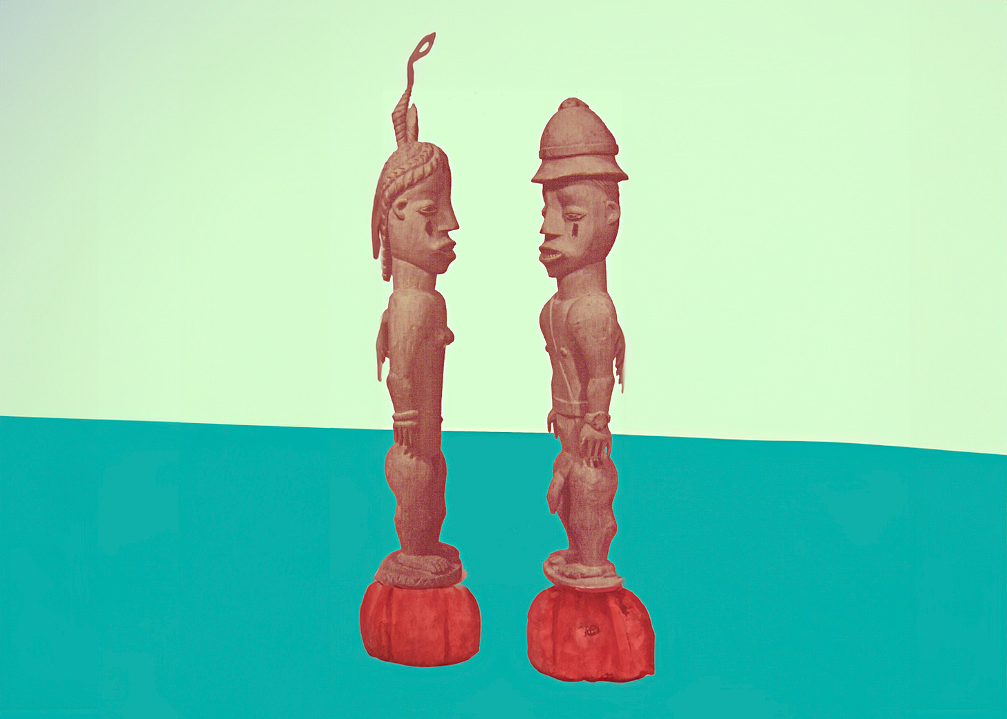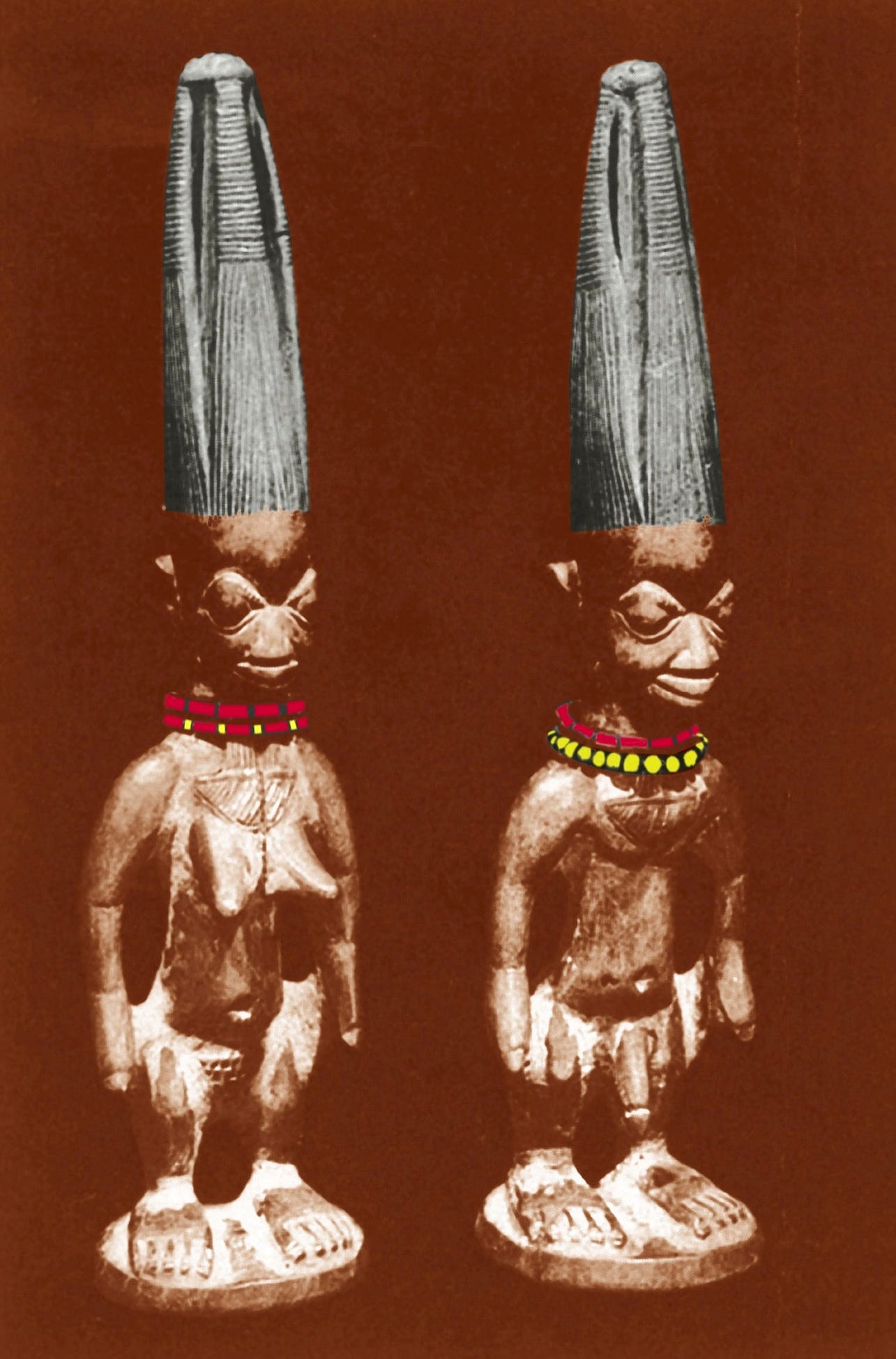 Many African religions teach that God was once closer to mankind, but because of abuse, has become more distant. One of the more colorful versions says that people took bites out of the clouds when they felt hungry, and wiped their greasy fingers on them; so God climbed a spider web up to a higher heaven. With direct communication cut off, messengers now become necessary. And who better for a messenger than friends and relatives in the remembered past? These people now dwell both in the world of the spirits and in the memories of people here on earth. But how to attract these spirits to hang around, nearby, ready to carry a message whenever needed? Just as people put out birdhouses, the Yoruba put out carved wooden totems—human figures that can serve as houses for the spirits of the remembered dead. (These have nothing to do with American Indian totem poles.) To look as inviting as possible, the totems always have the most desirable physical attributes: firm pointed breasts on the female figures, and large penises on the male figures. Among the Yoruba, the bond between twins is a powerful one. If one twin dies, it becomes an especially potent messenger. Thus, a favorite form of totem among the Yoruba are the ibeji, or twin figures. The ibeji traditionally appear as one male and one female, regardless of the sex of any actual twins.