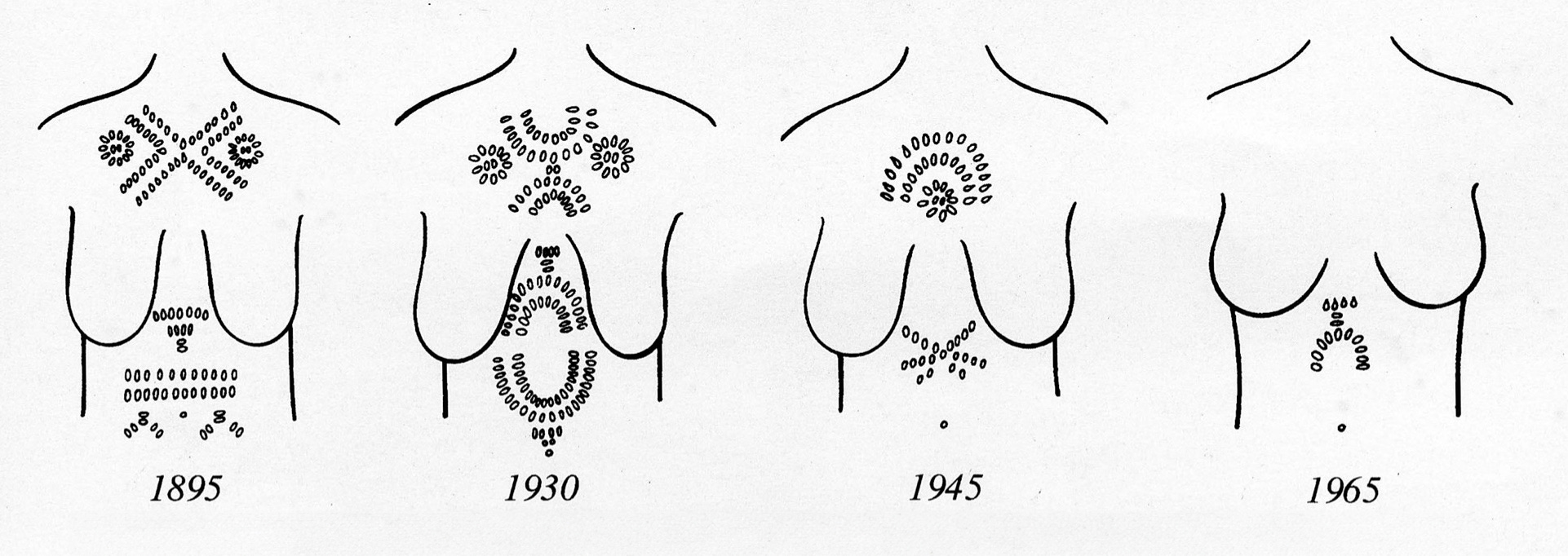 Rather than body paint, traditional Nuba women preferred the permanent designs of cicatrization, or scar patterns from hundreds of little slits cut into the skin. This cosmetic surgery occurs soon after the breasts form, and was once common all across Africa. For instance, the similarly-decorated “Bush Negroes” or Maroons of Surinam originally came from Nigeria and nearby areas. On reaching shore, they soon escaped from slavery and set up their own African villages in the South American jungle. There the tradition of bare-breastedness and cicatrization continues. Yet it remains a tradition of constant change. An interesting study of cicatrization patterns in Surinam shows that fashions in body decoration change just as rapidly as fashions in clothing do. The trend in recent decades has been toward smaller areas of scar patterns, but the fashion pendulum could swing as unpredictably in this as it does in clothing.