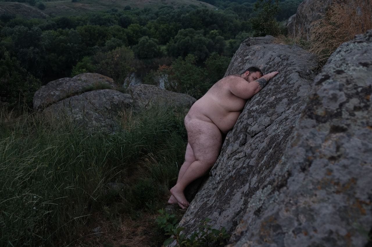 I got stuck poring over the work of Artem Humilevskyi recently, a welcome distraction from the work I should have been doing, had I not been scrolling in a fixated state through Twitter, an occurrence which has never happened before or since, I promise. Suddenly my thumb stopped over an image of a corpulent nude man leaned up against a bare rock, hugging the wall of what appeared to be a mountainside, the image washed a in cold gray infiltrating what otherwise might have been a tender, loving embrace.