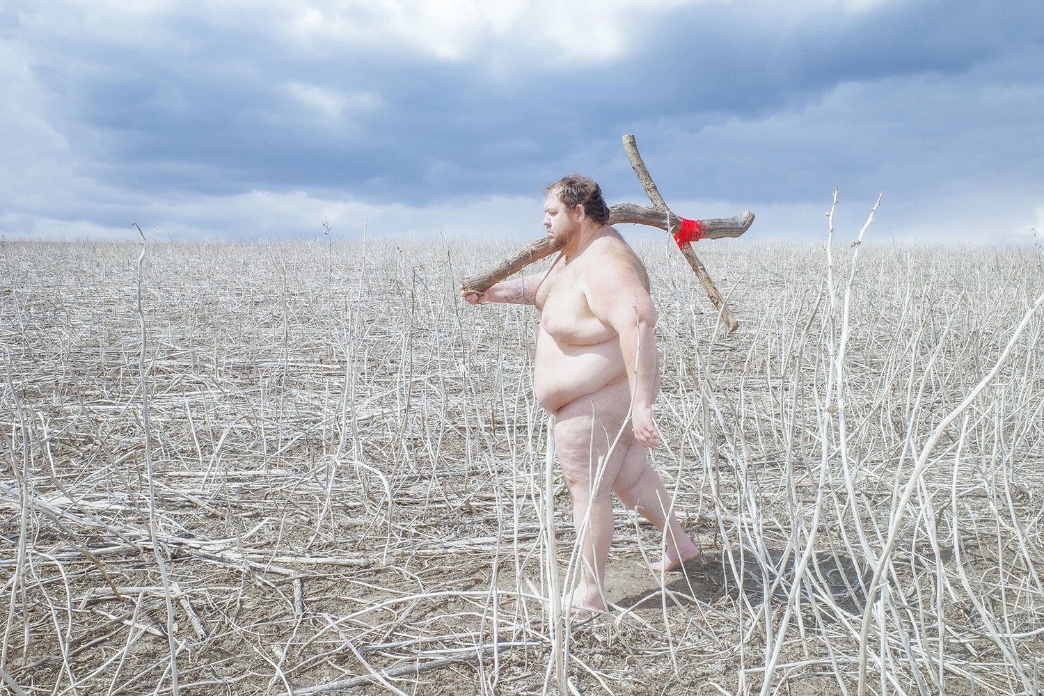 Clicking through to his profile and exploring his work, I got more of a snapshot of Artem Humilevskyi. I learned he is Ukrainian, a photographer and visual artist whose striking images have won awards and been exhibited in galleries and museums. His images feature himself as the subject, exploring a variety of ideas around identity and family. His various photo series, such as Roots and Giant, explore themes of heritage, home, and nature. His images are sometimes playful, often haunting, capturing a raw human spirit in a way that is evocative and stirring. They seem to tell a story that I can’t quite crack, each evoking a feeling of sacrifice, of journey, of place, or of connection.