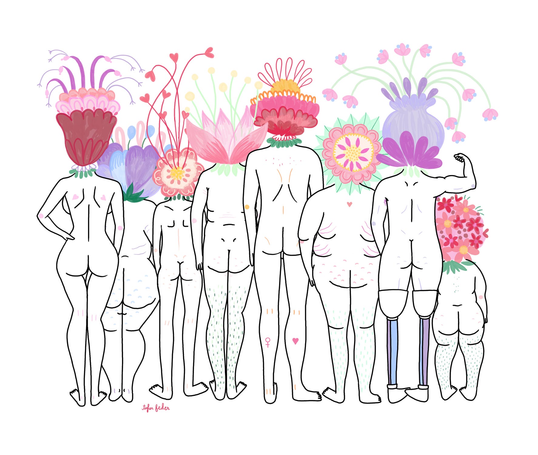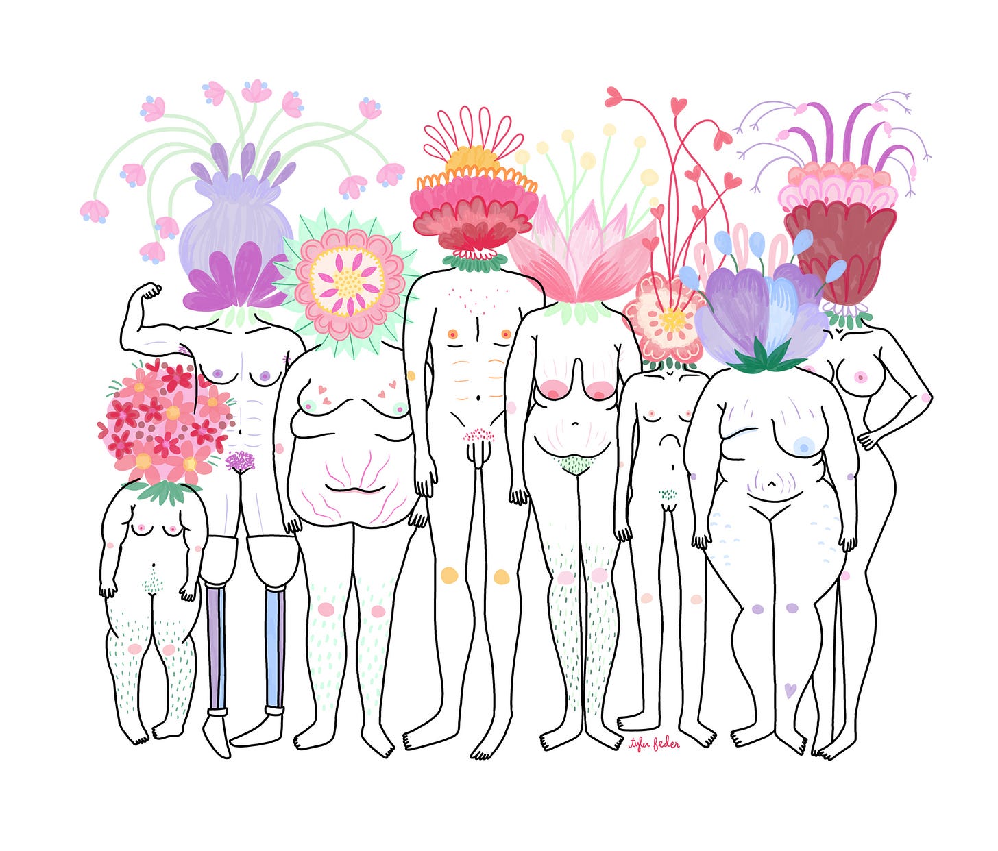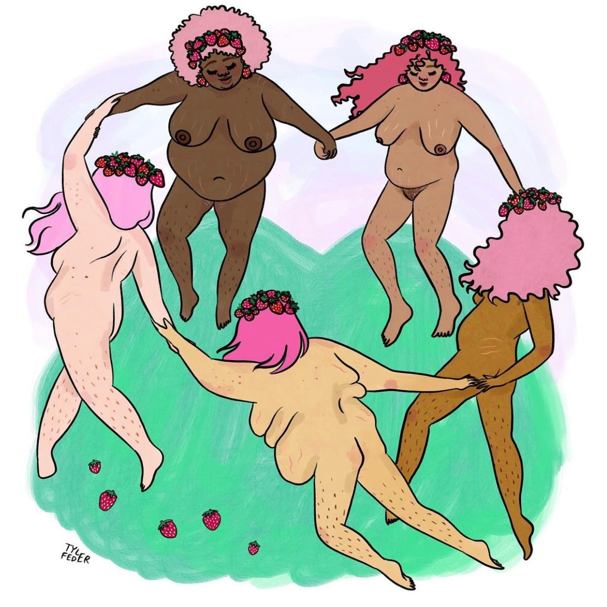 With each new reading of Bodies Are Cool, I found myself drawn to the artwork, and wondering about the artist. Eventually I looked into Tyler Feder’s work, exploring her instagram, website, and etsy shop, and I came to discover that her body of work makes up an amazing exploration of self love, gender and racial diversity, fat-positivity, and empowerment through nudity. I soon saw that her work embraces many of the themes and ideas of naturism.