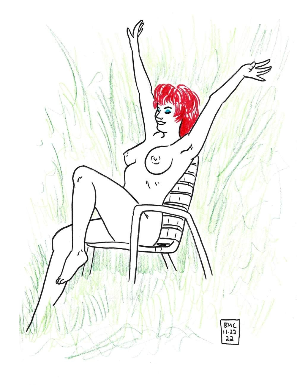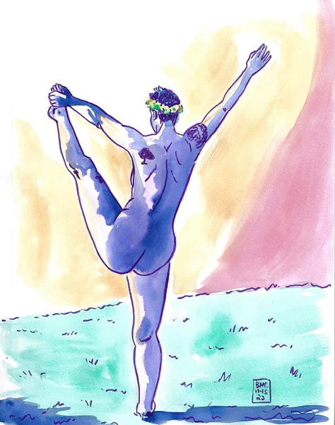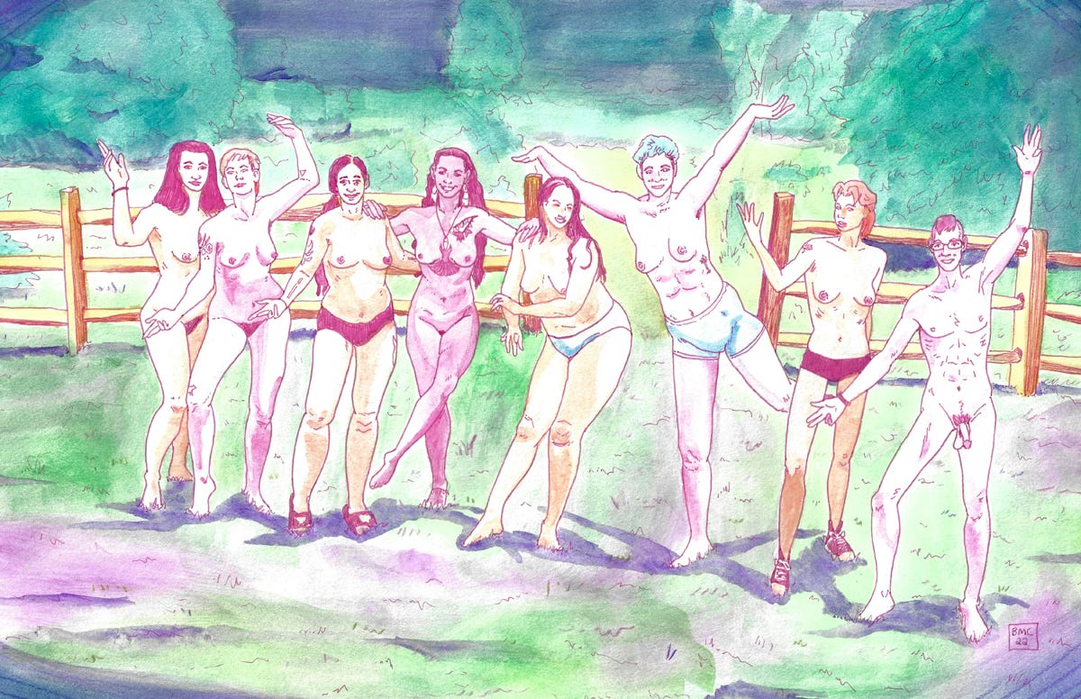 I also appreciate that Brett’s work honors nudism’s unique culture. The paintings and illustrations communicate a reverence for nudism’s past and present, and acknowledge the figures and images of that world. Their use of dance poses and body language celebrate the body, bringing a naturist-influenced view of liberation and transcendence to their images.