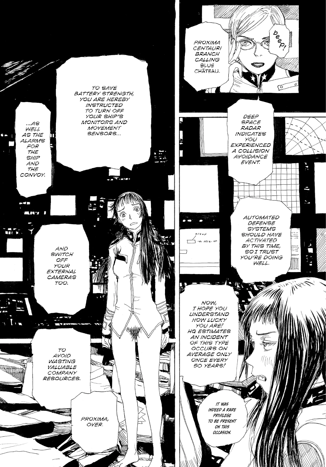Alone aboard the space freighter Blue Chateau, Moshi-Moshi Momo sits upon piles and piles of books, working out how to make sure the ship and its cargo reach their interstellar destination with the limited resources available. It’s a lousy job, but somebody’s gotta do it.