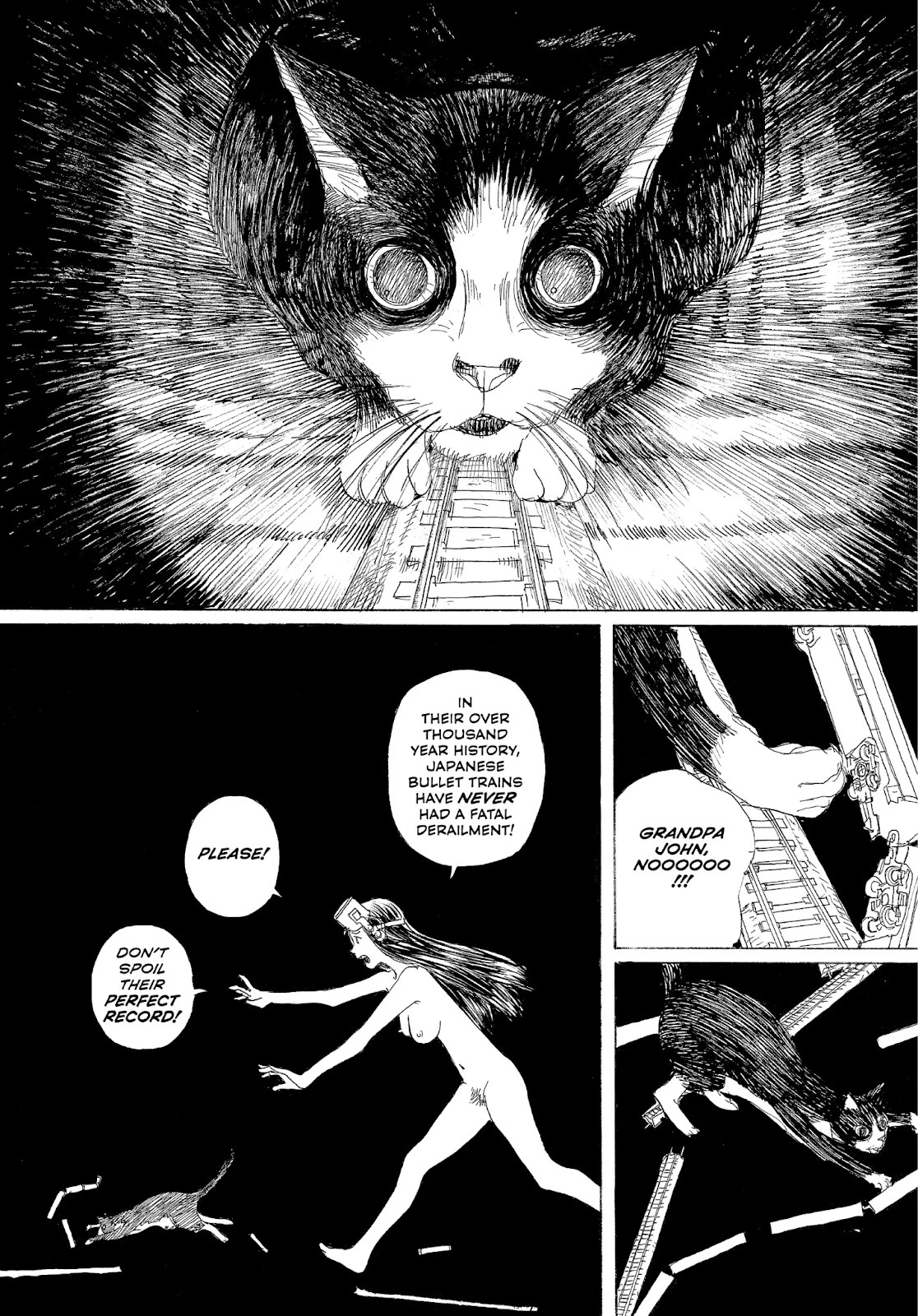 There’s also the question of the male gaze: on the one hand, Momo’s nudity and casual behavior, often sitting with her legs wide open, suits her character and her isolation. After all, she doesn’t have to worry about manners or other people. In a way, she’s feral, and not unlike Grandpa John the cat in how she chooses to live aboard the Blue Chateau. On the other hand, it feels a bit gratuitous. She’s drawn frequently in full, her body filling the pages, with her pubic hair being quite prominent throughout. It’s not by any means off-putting, it’s just something I think about constantly as an artist myself when drawing and painting nudes, and it’s admittedly a very subjective thing in this case. Nothing explicit is taking place, but I can’t help but feel just a little voyeuristic when I flip through the manga’s pages, especially since we have no way of knowing if this is how Momo would behave in any social settings, if it’s how she herself would want to be seen.