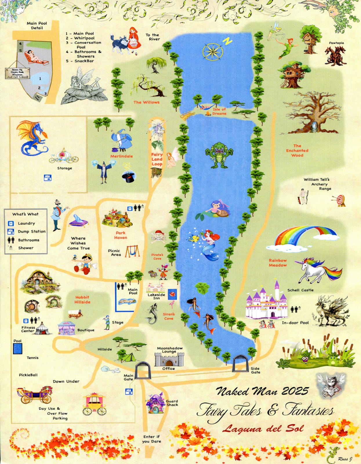 Part of it is by design. Laguna del Sol, which is about 30 minutes south of Sacramento, California, has a strict policy that requires a tour for first-time visitors. This is the typical tour you might have done at other nude resorts, but Laguna is large, so they take you around via golf cart and explain the policies and expected behaviors. Due to the huge number of people attending Naked Man, they don’t give these tours within a week of the event. This means you have to have visited Laguna at least once before and taken the intro tour. Luckily, both my wife and I had done this a couple years earlier and we were still in the system.