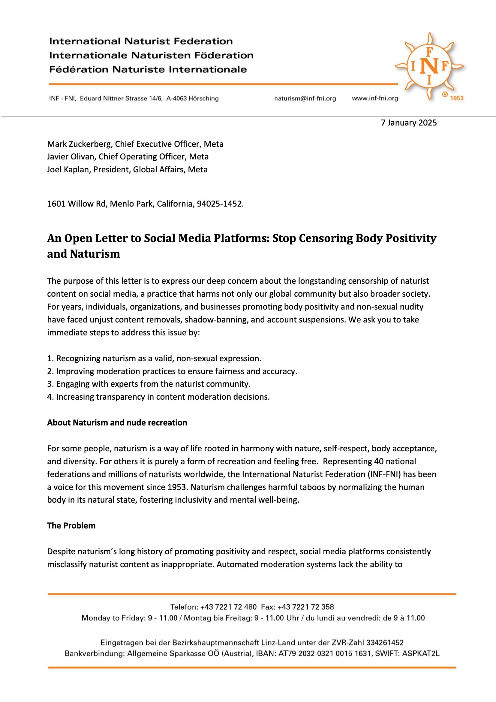 In an unprecedented global effort, naturist organizations and leaders from over forty countries have united to demand an end to the censorship of non-sexual nudity on social media. Spearheaded by the International Naturist Federation (INF-FNI), the open letter calls on platforms like Meta to reform their moderation policies. It has been sent directly to Meta and made public for other major tech firms, urging immediate action.