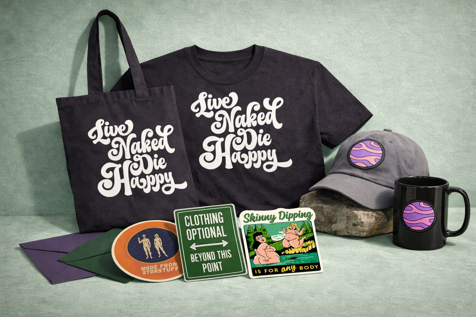 Choice of Planet Nude dad hat or “Live Naked Die Happy” T-shirt