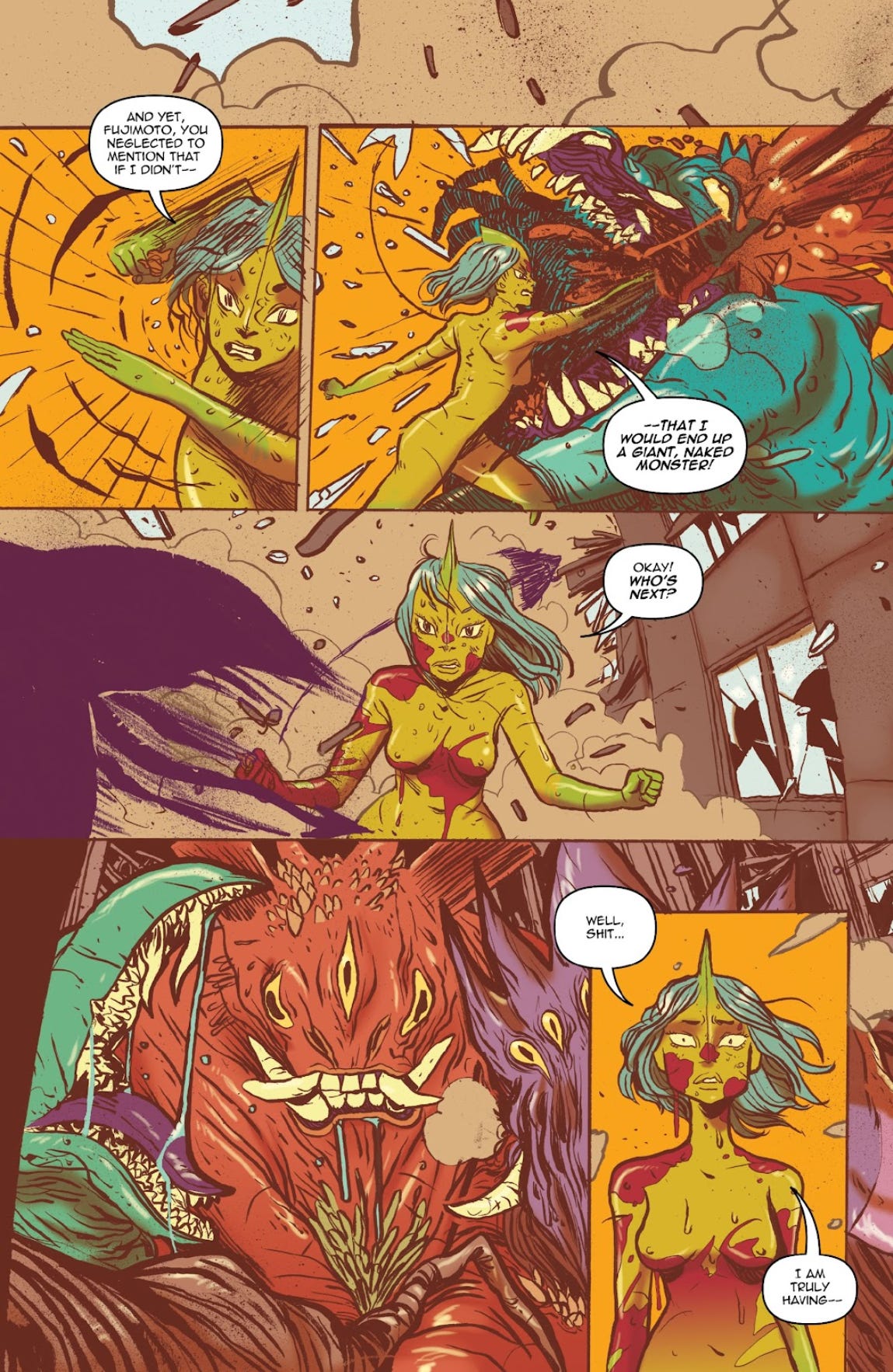 If I had a nickel for every time I picked up a comic recently in which a woman grows giant-sized and fights a kaiju while nude, I’d have three nickels. Which isn’t a lot but it’s weird that it’s happened thrice.