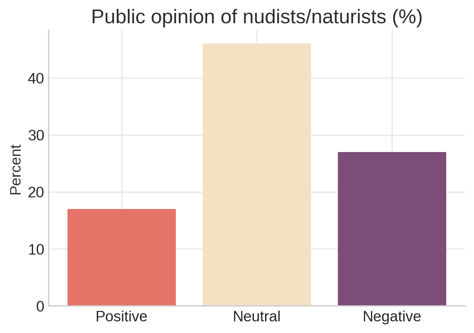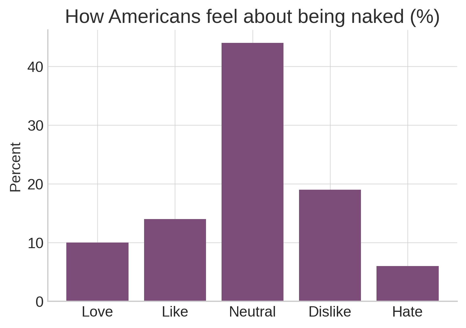 The topline results of this poll are sobering. Only 24% of Americans say they love or like being naked. Nearly half (44%) are neutral, while 25% dislike or hate it. Asked about nudists themselves, just 17% expressed a positive opinion, while 27% were negative and 46% landed in the neutral camp. Oof.