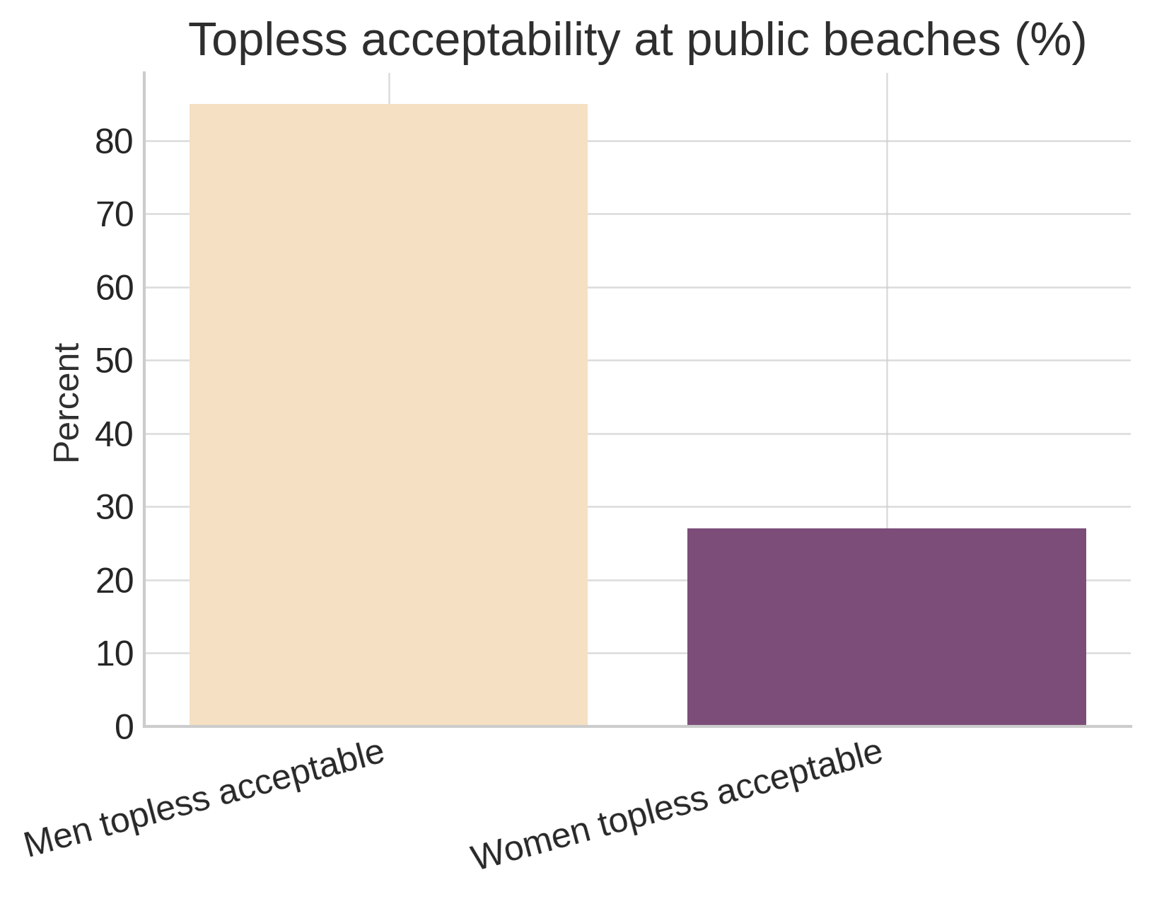 The topless double standard remains stark. Eighty-five percent of Americans say it’s acceptable for a man to be topless at a beach, compared with just 27% who say the same for women.