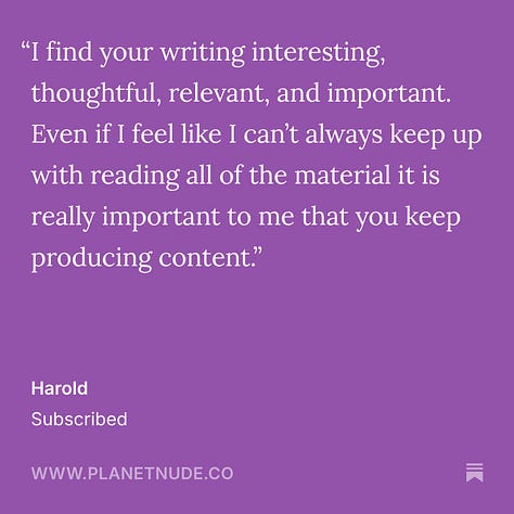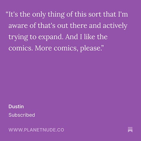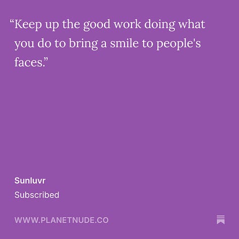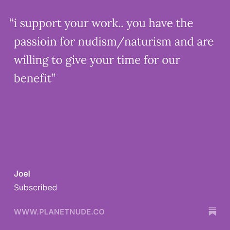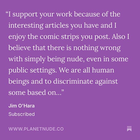 We appreciate all our readers of course, but without the paid subscribers, we wouldn’t be here. And these comments affirm to us that we’re doing something right. If you enjoy our newsletter, I would encourage you to consider supporting it with a paid subscription. If you value nudism/naturism as a movement, if you get value out of our journalistic reporting or enjoy our original comics, essays, stories and podcasts, think about supporting it like you would any other magazine or subscription service you enjoy. Your support helps keep us here doing this work. And if you do sign up now, leave us a comment when you do about why you value this community newsletter.