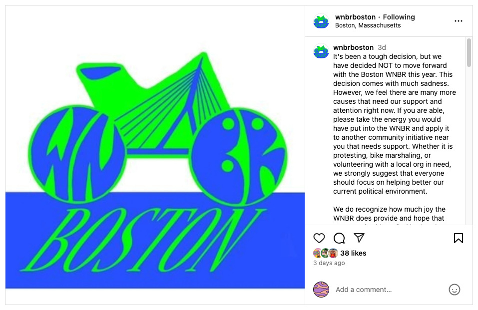 “It’s been a tough decision, but we have decided NOT to move forward with the Boston WNBR this year,” the organizers wrote. “We feel there are many more causes that need our support and attention right now.” They encouraged supporters to consider “protesting, bike marshaling, or volunteering with a local org in need,” emphasizing the need to “help better our current political environment.”1