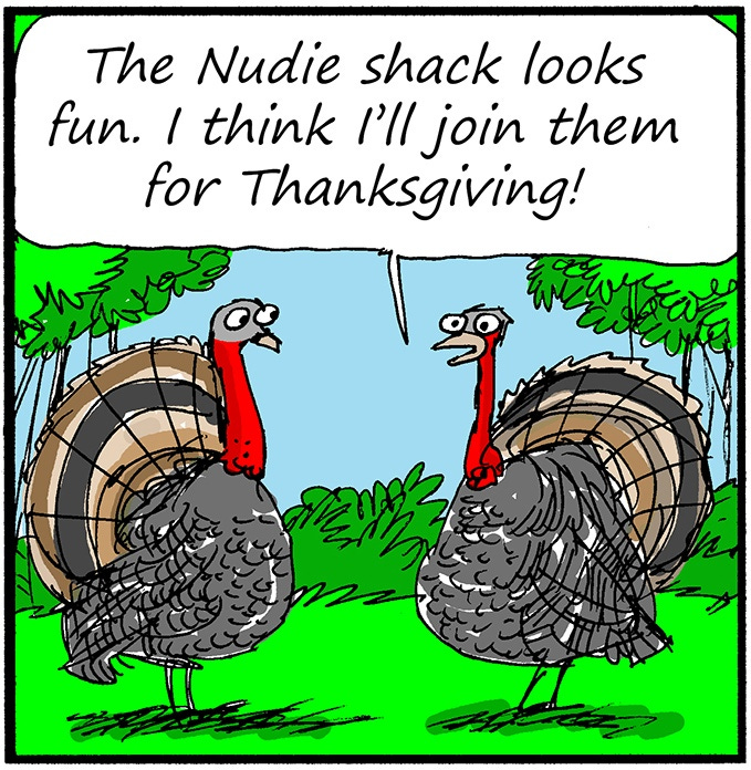 Panel 1: Two turkeys stand in a grassy clearing. One says, “The Nudie Shack looks fun. I think I’ll join them for Thanksgiving!”