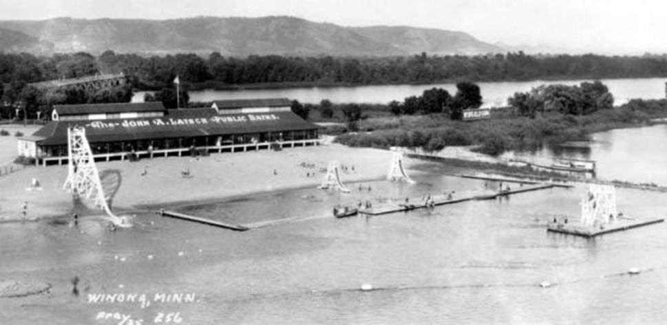 When John A. Latsch, a Winona businessman, became mayor in 1906, he negotiated an agreement with the railroad to lease the island to the city perpetually for use as a bathing beach for $10 per year. The island was already connected by the unique Winona Wagon Bridge and was willing to rescind any toll for people going to the beach.