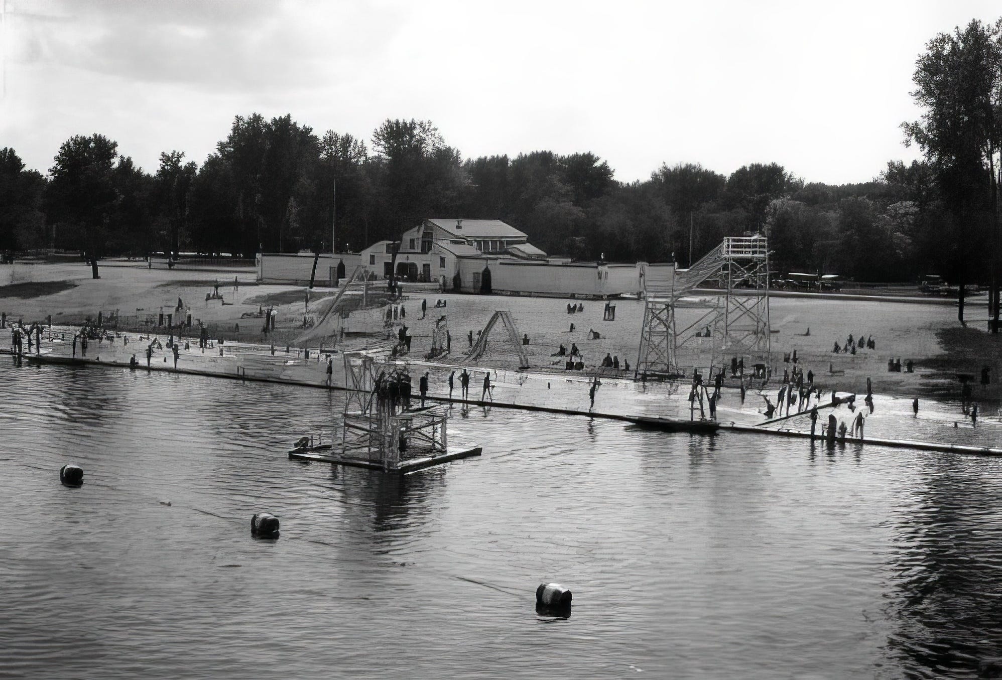 A bathhouse was quickly built, and the John A. Lasch Public Bath opened in 1907. Sand was dredged from the main channel of the river and used to expand the beaches and contour the river bottom at the bathhouse site. Piles were driven deep into the island for a foundation. Steel rails were bolted to the top of the pilings, solidly anchoring the 210-foot-by-23-foot bathhouse to the beach. When completed, the bathhouse had lockers for 116 patrons. There were two general dressing rooms, one for men, one for the ladies, with the ladies located on the west end of the building “so that they will not have to walk so far.”