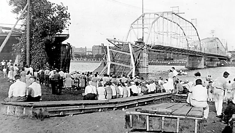 This was noticed in 1935 when a relative of the Landrieu family, the famous Louisiana political dynasty, was killed along with his wife when they hit the La Crosse Wagon Bridge with their car; the span collapsed, and the Plymouth went into the river.