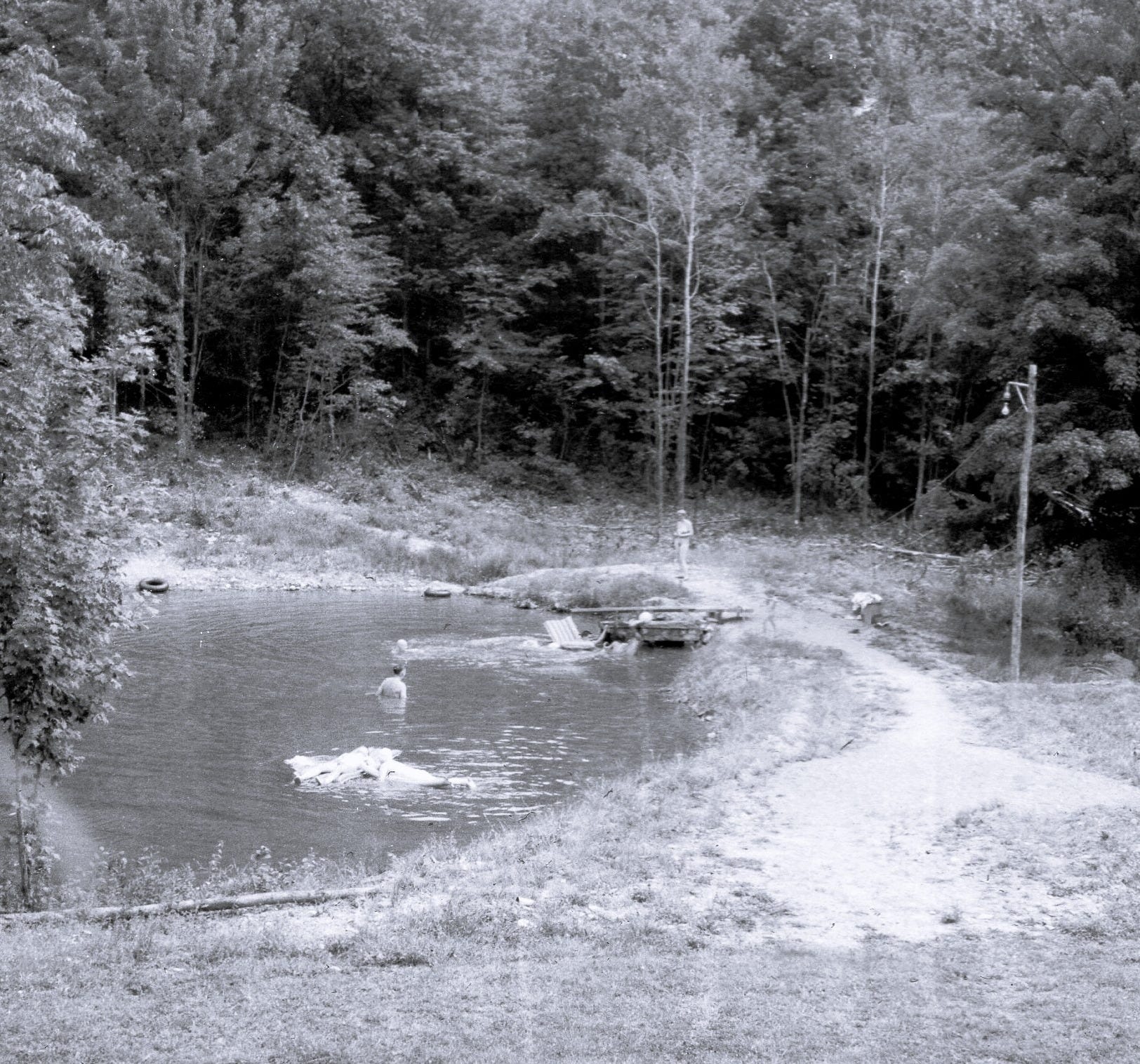 In 1963, NYPenns purchased another property — a seemingly perfect 225-acre parcel — for $23,000. Although the club had only thirty couples at the time, they believed it would soon grow into a 400-member camp and become the largest nudist camp east of the Mississippi. To get there, they had to start from scratch. The property already had a 20-acre Indian Lake with a forty-foot dam and a waterfall. They drew up plans for a playground, swimming pool, and housing. The group was stretched thin that year, and when their big August 1963 gathering arrived, a sudden wet cold snap hit the hills. One can almost feel the melancholy among those cold, tired naked bodies.
