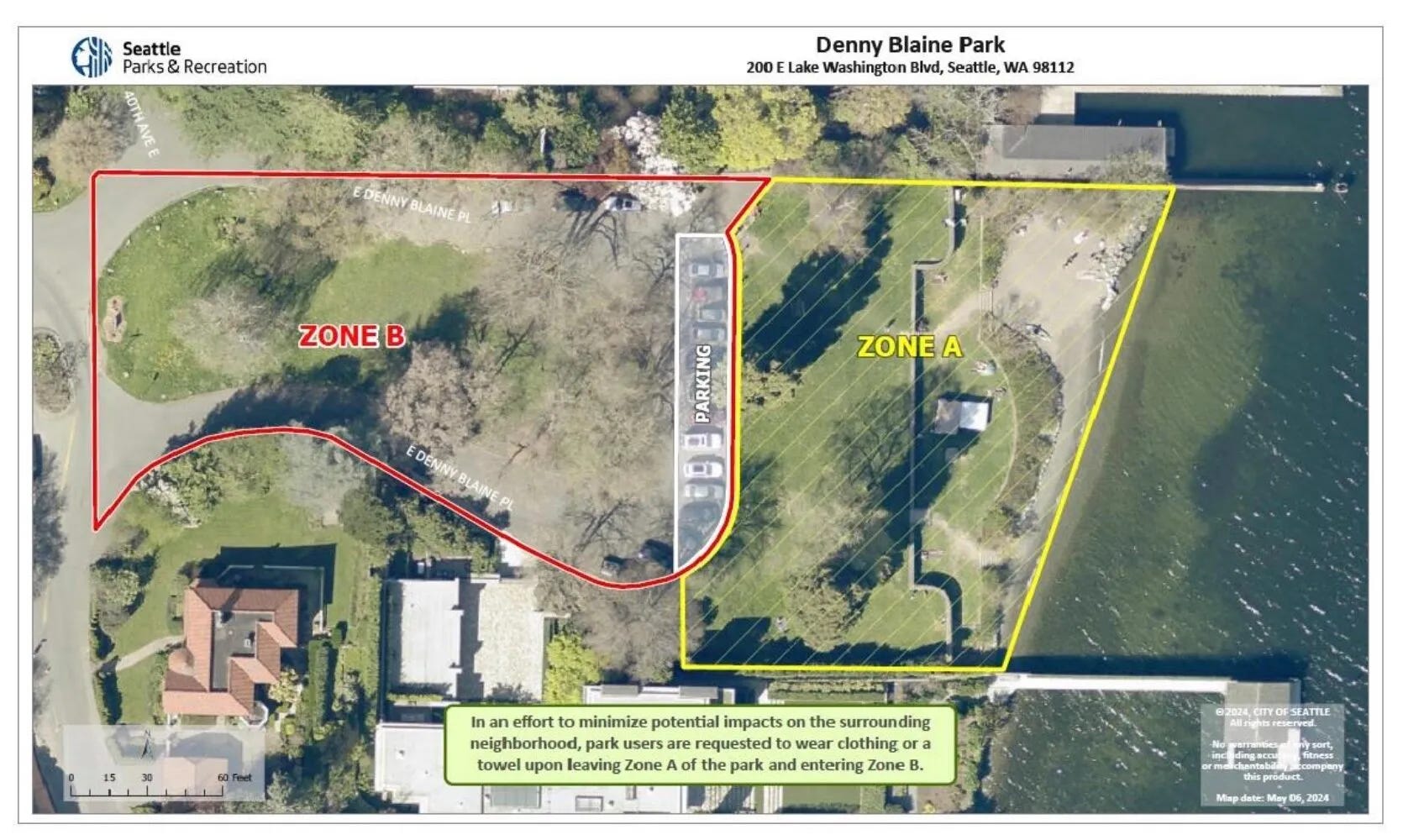 The new policy proposal, technically referred to as supplemental usage guidelines, aims to explicitly codify the legality of nudity at Denny Blaine Park, while also creating designated zones to address neighborhood concerns. The proposal outlines two zones within the park: Zone A, near the water, where visitors can be nude or clothed, and Zone B, around the entrance, where visitors are requested to wear clothing or at least a towel.