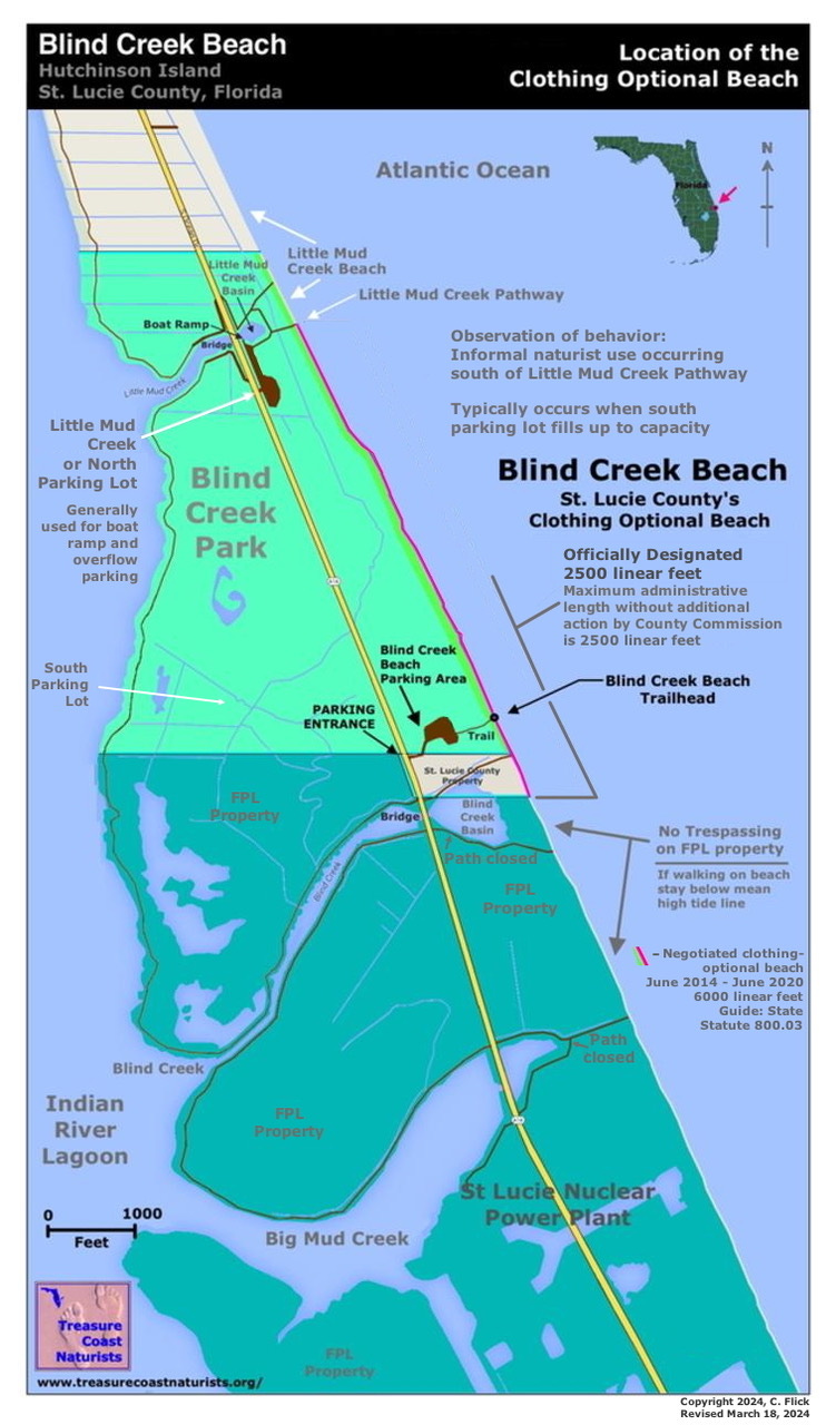 Blind Creek Beach was officially designated clothing-optional by the county commission in 2020 following years of advocacy by Treasure Coast Naturists (TCN). The beach’s main parking lot has been closed since January for a renovation project that includes new paving, showers, and restrooms. During the closure, some beachgoers have accessed the shoreline through the Little Mud trailhead—a non-designated area located north of the official nude zone.