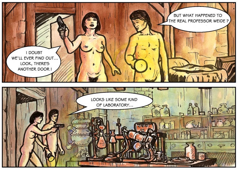 The spoiler is this: After the two run into each other while snooping around the castle, Eve reveals to Adam that she is actually an alien from the planet Naturn in Galaxy NUO35. She reveals the history of her home, which had its own naturist revolution. However, the leader of an underground resistance, Textyran (you’ll notice none of the names here are subtle), escaped the planet and came to Earth! Eve suspects he is plotting to undo Earth’s own revolution and reintroduce clothes to the population and has followed him to Earth to stop him. Okay, no more spoilers from here on in.