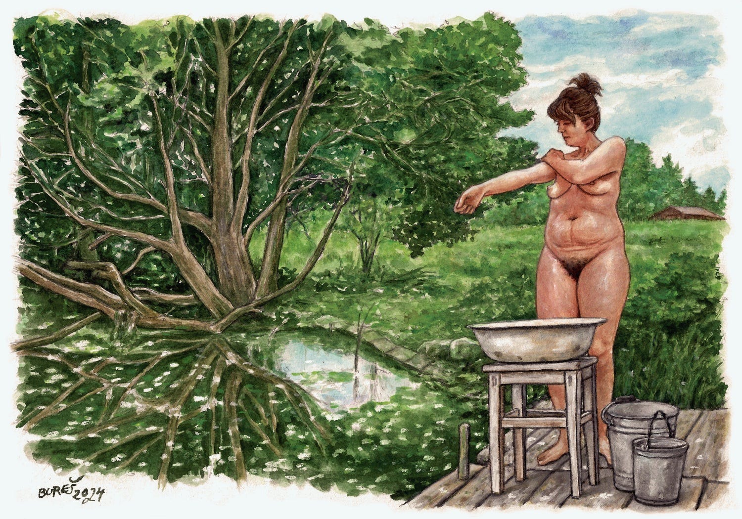 Looking at the creator’s website is a delight too: Bureš plays with so many different materials and styles. There’s photography, graphic design, realistically painted landscapes and portraits, and so much of it is naturist in theme. I highly recommend clicking around. There’s also an untranslated comic there called Dragonfly that I’m curious about. Looking at the pages, seeing soldiers chasing and shooting at naked people, I wonder if this may connect with Storm Clouds and be about the beginnings of the naturist revolution itself? I’m just guessing though! What do you think? 🪐