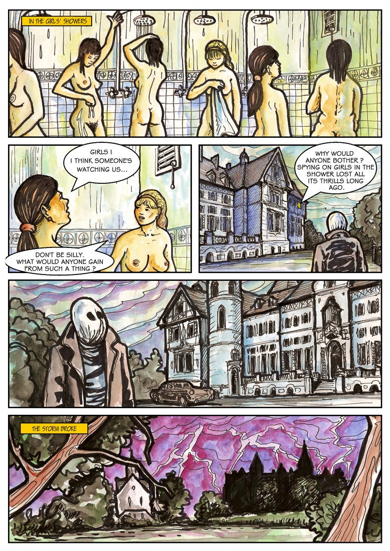 When night falls, a storm begins to approach and people start acting weird. Renata, one of the students, gets up to find a bathroom and is followed by a strange, clothed and masked figure. She finds a dress and puts it on before she screams and goes missing. In her room, Professor Triest withdraws some carefully hidden lingerie and puts it on. We also learn that Eve has brought a gun with her, but for what purpose, we don’t know.