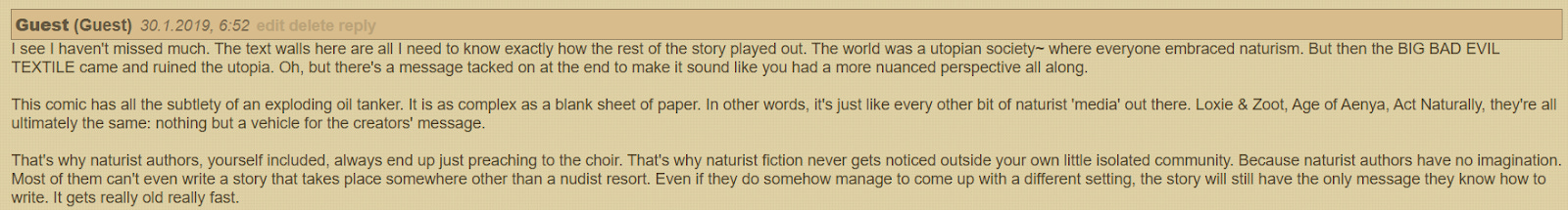 It was refreshing that not once does anybody in the comic mention anything about the joys and benefits of nudism, which is something that gets crammed into almost all other nudist media. Everyone here is nude, there’s no need to explain it because, frankly, nobody who isn’t at least interested in nudism in general is going to read this. Within the history of the world in this comic, we’re past that point. To that end, there was something that caught my interest when I browsed the comments beneath the final page, and it was this particular critique by an unnamed user in 2019: