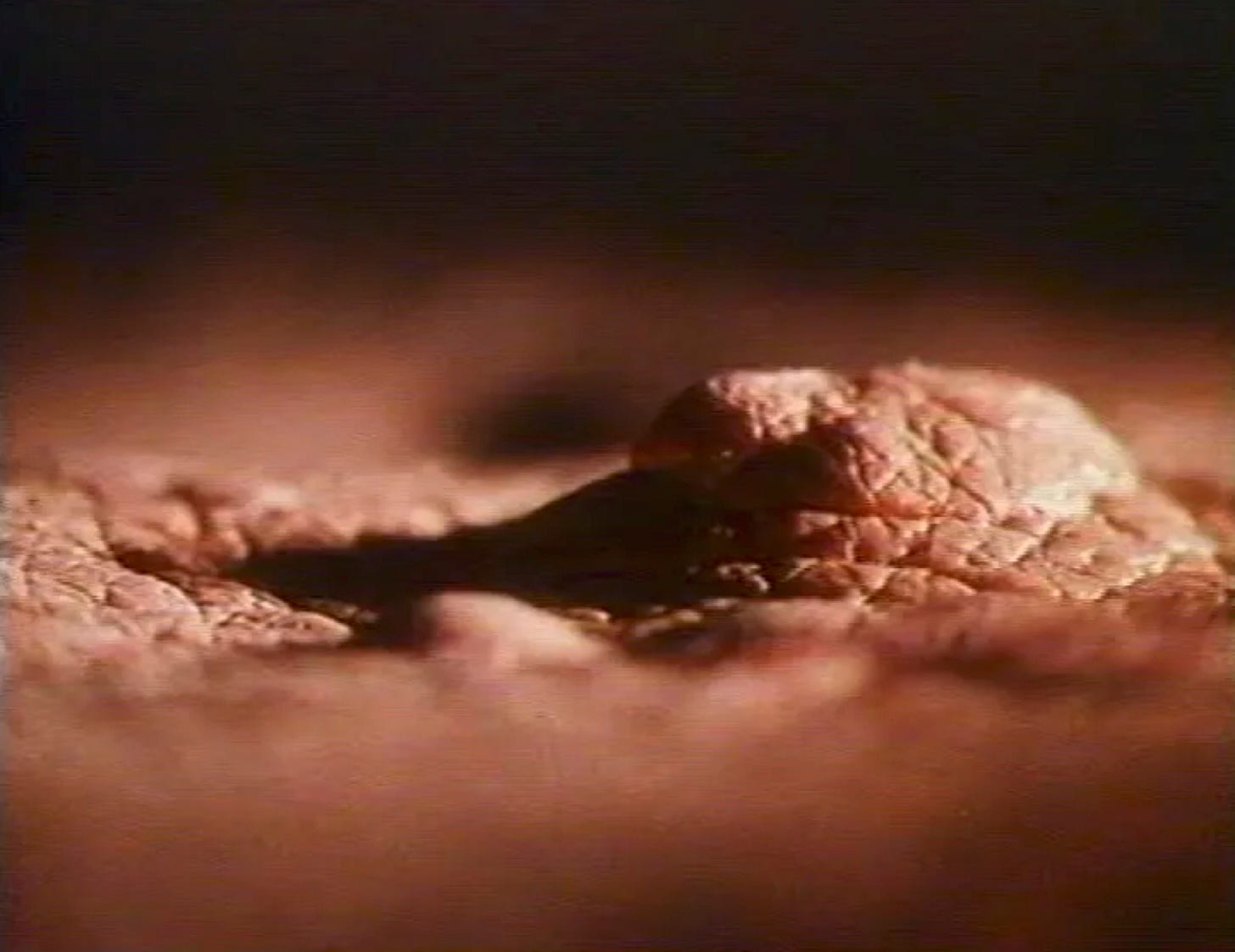 The documentary is primarily driven by images of the body from all ages and from many different angles, including extreme closeups (one notable shot is of a nipple looking like a mountain in a barren, alien landscape) and repeated use of internal cameras showing what goes on under our skin. Despite watching a VHS rip, it was quite beautiful. There’s an opening shot where the camera moves along a long lineup of people from young to old, starting with a small baby and ending zoomed out to show a studio full of people in varying states of undress. These people are the documentary’s primary models: we see them interacting throughout the documentary, talking about their experiences, singing, tickling, massaging one another, exploring each other’s bodies.