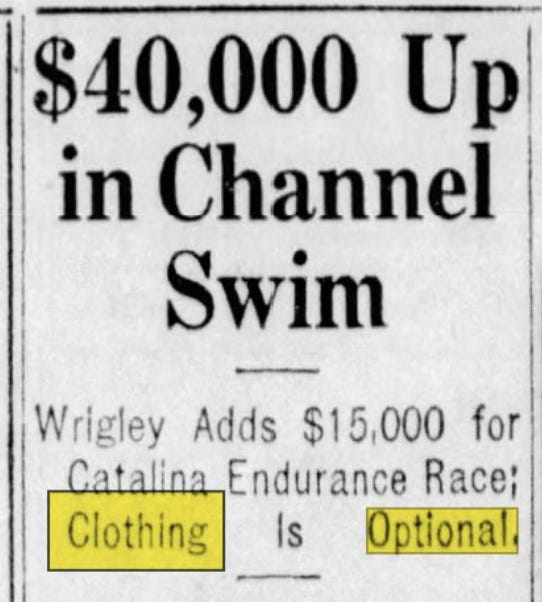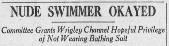But when did it mean being naked? When Tom Perrin asked his question, I had some writing projects saved up, but unfinished. I had stored an AP newspaper article from December 10, 1926. I looked at it again. When William Wrigley Jr. proclaimed the day before that his “Wrigley Ocean Marathon” would be “Clothing Optional.”