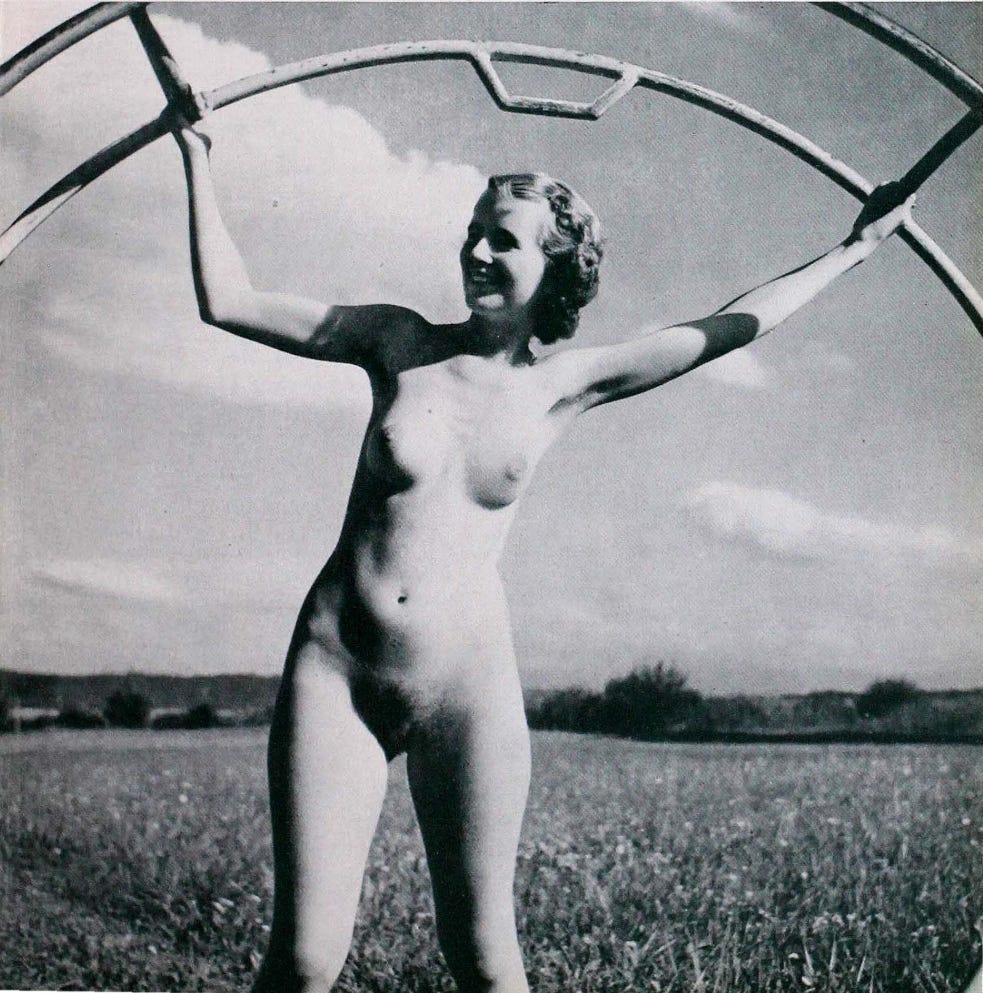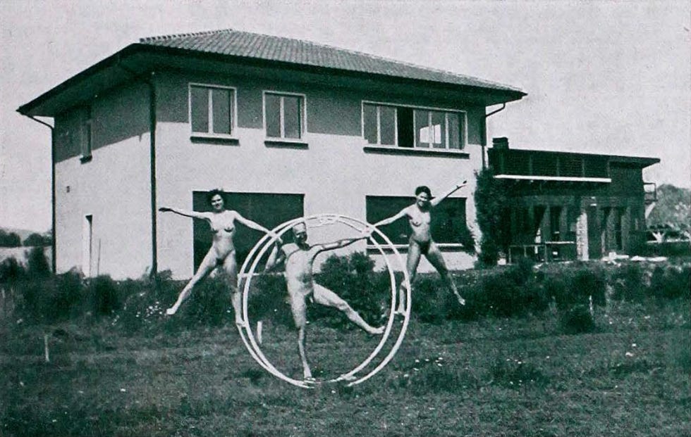 All of that was clothed. The Rhönrad was a mainstream German gymnastic apparatus with an active public life well before it ever appeared at a naturist gathering.