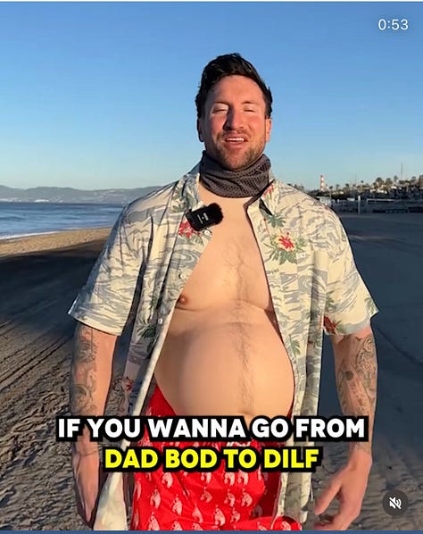 The Inadequacy Industry doesn’t quit, of course. Thanks to social media, we can be bombarded on our screens rather than waiting to see a billboard far from the intimacy of our homes. Now in my mid-40s, I’m bombarded daily with social media ads questioning my “Dad Bod,” asking if I want to become a “DILF,” showing me that I should be engaging in a variety of conflicting dietary plans, doing cardio, not doing cardio, doing chair yoga, blasting my “man boobs,” and on and on and on (if only, if only, if only…).3