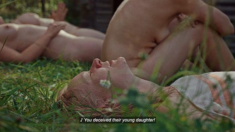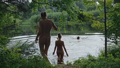These gatherings are a recurring ritual for these women, as we see the landscape outside of the sauna change with the seasons. Outside the small, wooden building, we see them step out into the snow together nude to quickly hop into a frozen lake, where one of them had earlier cracked open a spot in the ice. The plunge is a refreshing break from the heat indoors. We also see them chopping meat to smoke within the sauna, which they enjoy together later in the year. At one point the women dance together clothed while one plays an accordian. Later, when it’s warmer and everything is green, we see them lay outside in the grass, singing together nude in the sunshine.